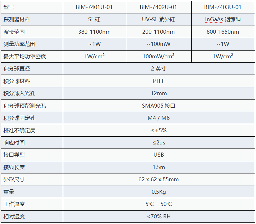 Brolight BIM-740xU系列USB积分球型功率计,是基于2英寸积分球(其他尺寸可定制),根据波长及灵敏度要求选择紫外增强型硅、硅、砷化铟镓(InGaAs)等不同探测器集成的功率计。其可测量的波长范围覆盖200nm至1650nm。