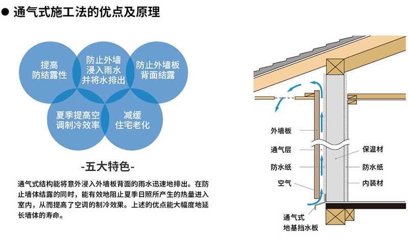 日吉华板采用了先进的干挂板材施工工艺,利用板材的企口搭接,使用金属挂件,地基基材等十余种不同的、日吉华独有的辅助材料,连接固定在单向龙骨上;采用了独创的通气式施工法,在外墙板材的背面和基层墙体之间形成一个能流通空气的通道,可使墙体内的湿气排出,并保持墙体干燥。