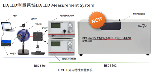 除BRM-6301 发散角测试仪外,还可以通过选配功率计、积分球、安装座、电流控制器、温度控制器等组成LD/LED光电特性测量系统,进行光电特性如光谱特征和功率数值、阈值电流Ith、阈值电压Von、额定电压Vop、线性电阻Rs、转换效率WPE、器件温度、峰值波长、光谱带宽等等性能指标测量,非常适合工业和科研等领域的应用。